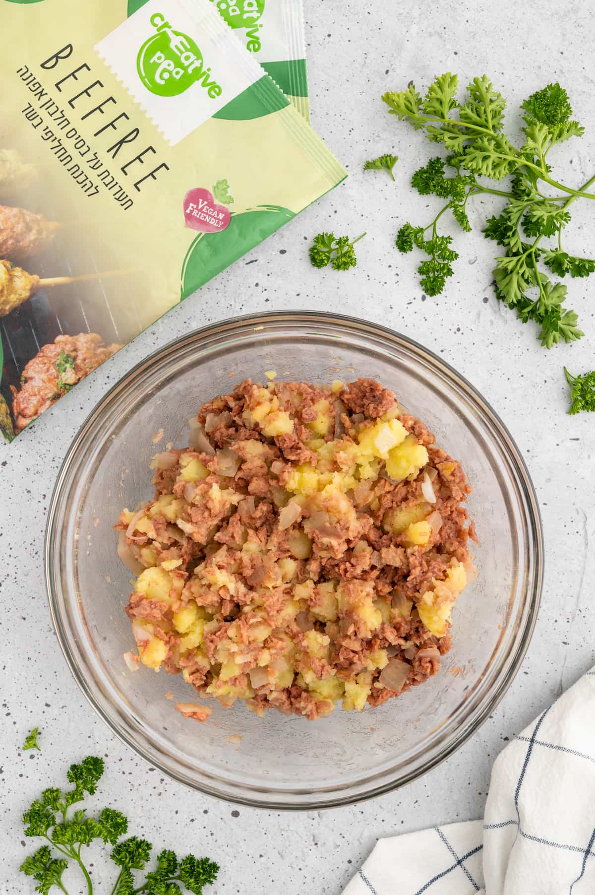 If using Creative Pea’s BEEFFREE, rehydrate half a package according to instructions. Combine rehydrated BEEFFREE with onions, then mix with mashed potatoes.