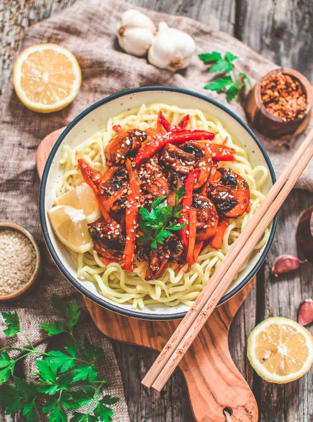 Your eyes are immediately delighted with the sight of contrasting color combinations and the superb smell of spices that will knock your socks off! The triple texture of this dish with its soft mushrooms, slightly firm veggies, and smooth & curly noodles will touch your tongue in a terrific way. Crunchy carrots and toasted sesame seeds burst the sound bubble of this delicious dish, which delicately dances on your taste buds.