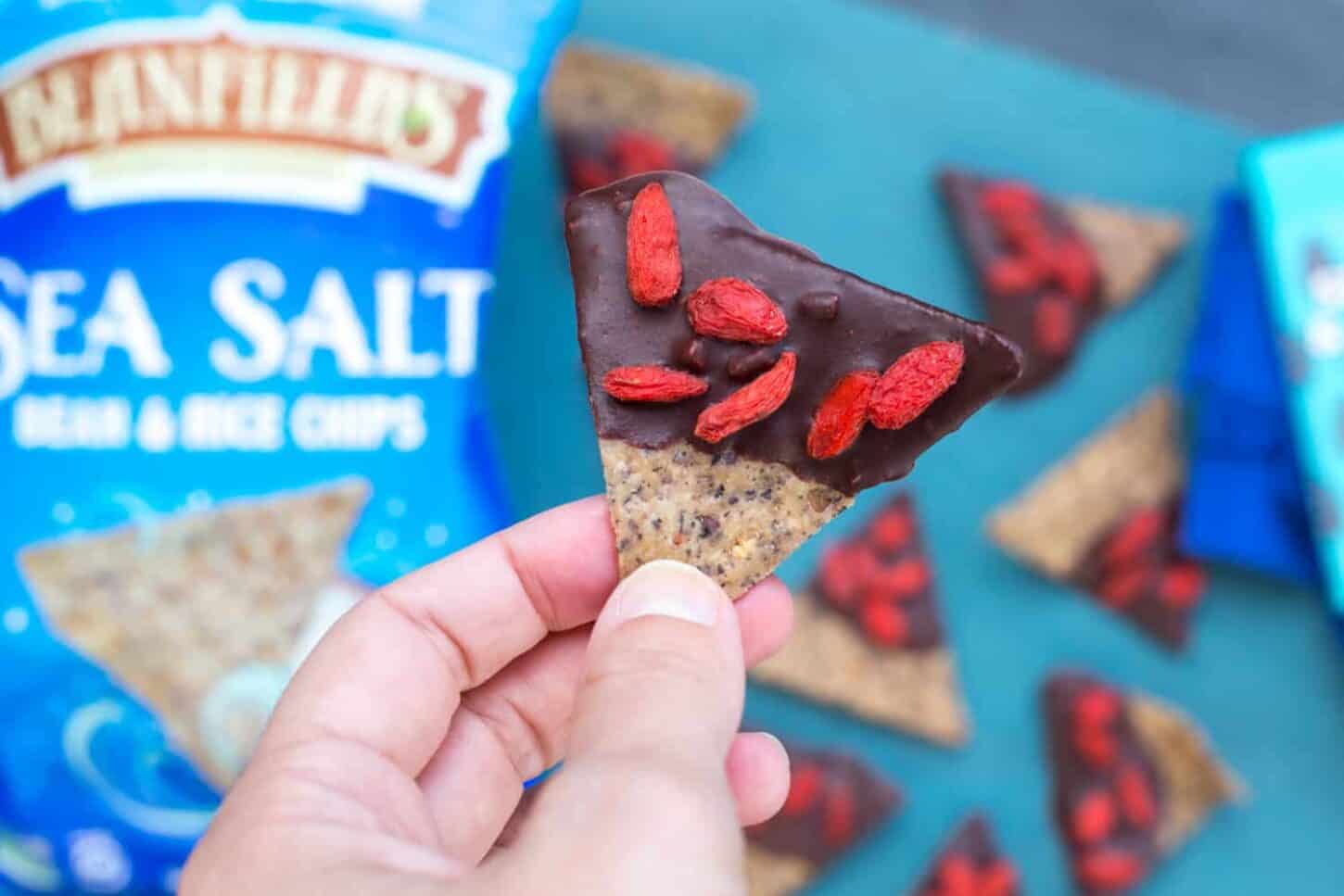 We’re starting with a base of Sea Salt Bean and Rice Chips from Beanfields. These chips are packed with plant protein and fiber, and also happen to be non-GMO, gluten-free, and of course, vegan. Then we add a dose of antioxidants by dipping the chips in melted dark chocolate (vegan, of course). And finally, we really ramp up the health factor by sprinkling these chips with goji berries!