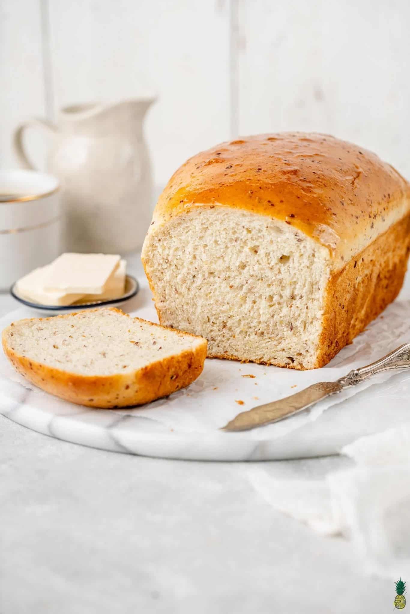 If you’re looking for a hearty sandwich bread, look no further! This seeded spelt bread has everything you need to get through a mid-day hump and contains plenty of protein thanks to its seeds and high-gluten wheat flour.